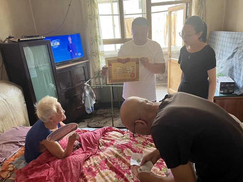 6月28日,安裝公司、物業(yè)公司聯(lián)合旱西關(guān)東社區(qū)工作人員組成慰問(wèn)小組開(kāi)展“慰問(wèn)抗美援朝老兵遺孀 真情傳遞溫暖人心”慰問(wèn)活動(dòng)?;顒?dòng)中,慰問(wèn)組一行前往抗美援朝老兵史黑則遺孀家中,詳細(xì)詢問(wèn)了老人的生活和身體情況,叮囑老人要保重身體、安享晚年,并送去了牛奶、瓜果等慰問(wèn)品。同時(shí),慰問(wèn)組一行還看到了保存多年的獎(jiǎng)?wù)录白C書,大家紛紛表示要繼承革命先輩的光榮傳統(tǒng),汲取紅色力量,堅(jiān)定奮進(jìn)步伐,用實(shí)際行動(dòng)迎接黨的二十大勝利召開(kāi)。