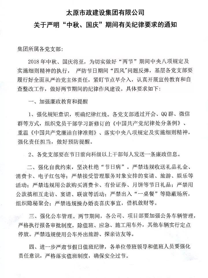 太原市政建設(shè)集團(tuán)有限公司關(guān)于嚴(yán)明“中秋、國(guó)慶”期間有關(guān)紀(jì)律要求的通知