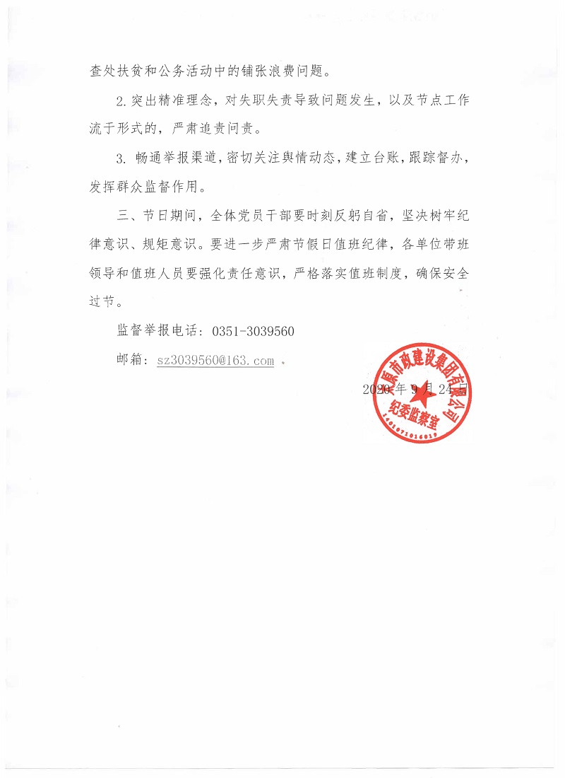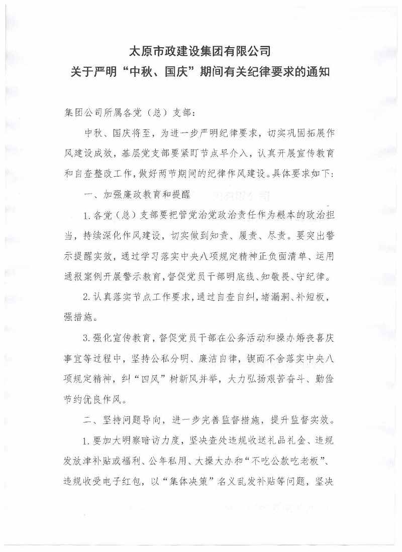 太原市政建設(shè)集團(tuán)有限公司關(guān)于嚴(yán)明“中秋、國慶”期間有關(guān)紀(jì)律要求的通知
