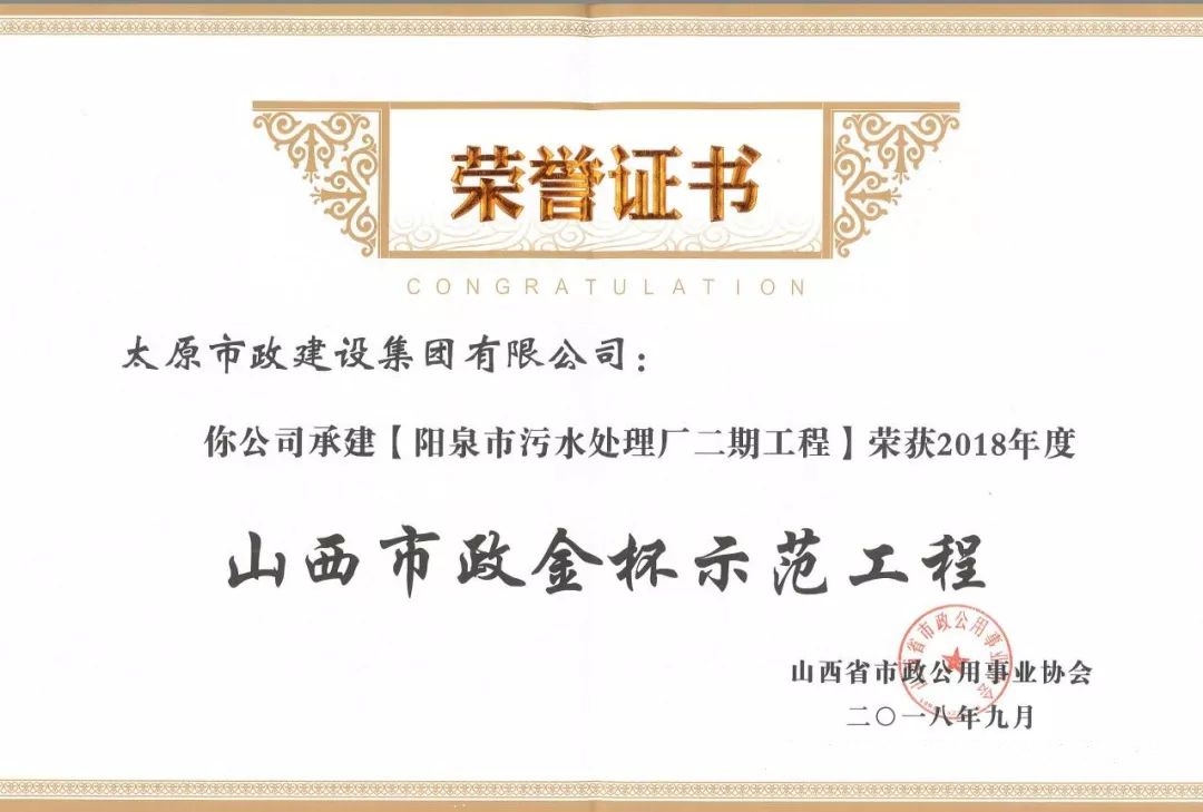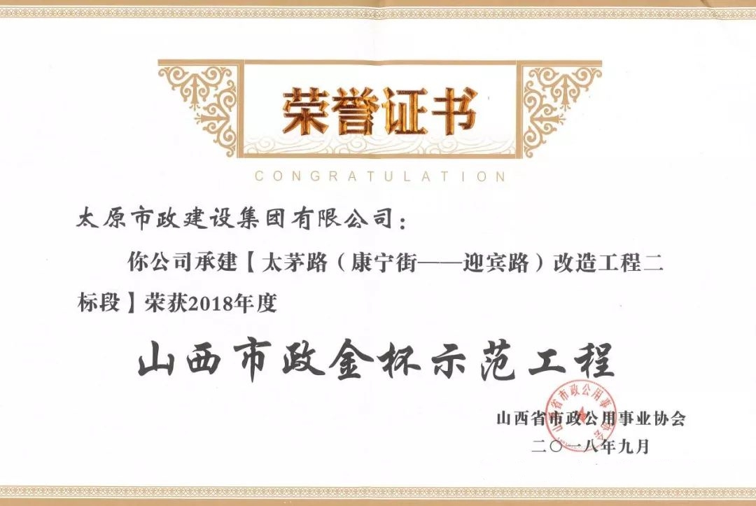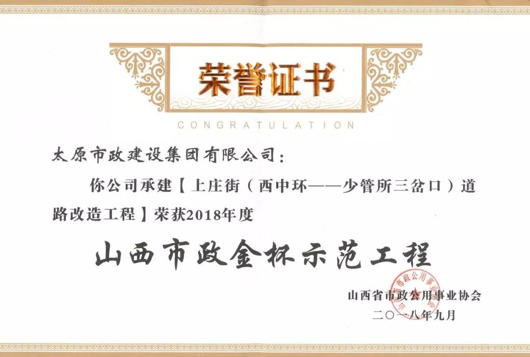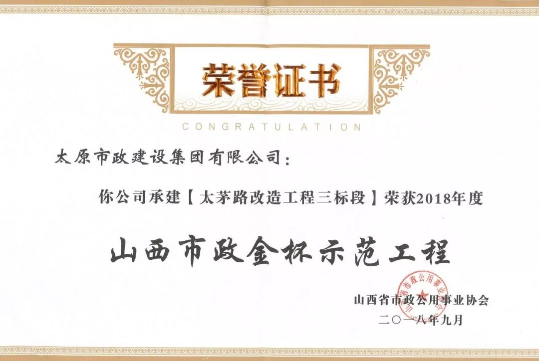 9月20日,太原市政建設(shè)集團(tuán)有限公司承建的太茅路改造工程三標(biāo)段、陽泉市污水處理廠二期工程、上莊街(西中環(huán)——少管所三岔口)道路改造工程、太茅路(康寧街——迎賓路)改造工程二標(biāo)段榮獲山西省市政公用事業(yè)協(xié)會頒發(fā)的2018年度“山西市政金杯示范工程”榮譽(yù)稱號。