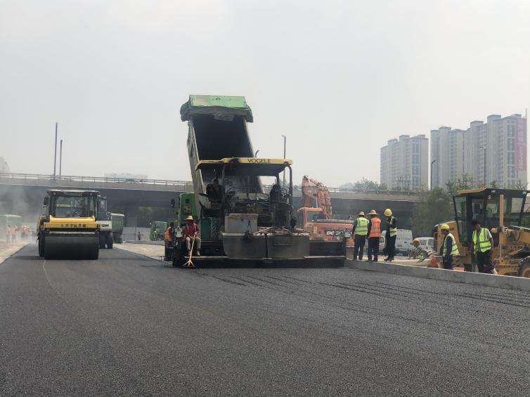 面對工期緊、任務重等情況,項目部不等不靠、見縫插針,緊抓一切施工有利時機,快速推進該工程東段道路下面層和中層瀝青混凝土鋪設作業(yè)。由于瀝青攤鋪施工受到雨水天氣、環(huán)保管理等因素影響,項目部結合實際組織施工,狠抓現(xiàn)場管理和過程控制,確保施工質(zhì)量、進度等各項工作處于時刻受控狀態(tài)。施工中,項目部超前部署、提前著手,調(diào)配攤鋪機、壓路機、運料車等機械,做好各項準備工作,并要求施工人員嚴格把關各道工序,協(xié)調(diào)推進攤鋪進展;施工人員緊盯現(xiàn)場,全程跟進攤鋪過程,確保整體攤鋪質(zhì)量。同時在該工程的西段施工現(xiàn)場,管線施工、路基平整、路側石砌筑等工序在作業(yè)面同時開展,有效壓縮工序間的銜接時間;在管線施工中,項目部重點部署溝槽回填施工,嚴格保障回填質(zhì)量達到規(guī)范要求。