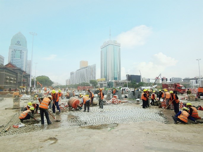 廣場(chǎng)南路段是目前施工最為忙碌的一個(gè)路段,花崗巖丁石砌筑、路面清理、廣場(chǎng)綠化、路側(cè)石安裝多道工序同時(shí)進(jìn)行。道路一側(cè)工人們正在進(jìn)行花崗巖丁石切割、鋪裝、灌縫、打磨,另一側(cè)路側(cè)石的安裝、砌筑也在同步作業(yè);園林綠化還在進(jìn)行廣場(chǎng)的裝飾;叉車來(lái)回穿梭著運(yùn)送石料、水泥,霧炮車在工地上不停降塵,灑水車正在對(duì)路面進(jìn)行清洗,打磨機(jī)正在對(duì)花崗巖丁石進(jìn)行打磨,全體施工人員上下一心,24小時(shí)奮戰(zhàn)在施工一線,以“鐵軍”的堅(jiān)定意志,確保工程按期完工。