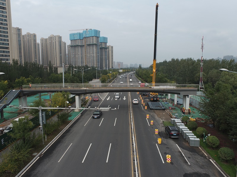 十四項(xiàng)目部承建的文興路匯豐南街人行天橋已于10月3日全部完工。濱河?xùn)|路翠馨路人行天橋目前正在進(jìn)行梯坡道安裝和主橋鋼箱梁焊接。施工中,項(xiàng)目部合理分配作業(yè)時(shí)間,在10月10日夜間實(shí)施梯坡道的吊裝作業(yè),現(xiàn)場(chǎng)安排專(zhuān)人指揮機(jī)械進(jìn)行吊裝,嚴(yán)格要求操作人員按照吊裝操作流程規(guī)范作業(yè),全力保障梯坡道吊裝施工安全順利推進(jìn)。白天進(jìn)行西側(cè)公交站臺(tái)附近的人行道磚鋪設(shè),項(xiàng)目部重點(diǎn)加強(qiáng)質(zhì)量控制,首先清除基層底灰渣和雜物,在鋪貼定位后,將面包磚均勻輕擊壓實(shí),確保鋪砌穩(wěn)固,表面平整,縫線直順,灌漿飽滿,始終將質(zhì)量標(biāo)準(zhǔn)落到實(shí)處。