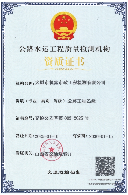 近日,筑鑫公司成功獲得公路水運(yùn)工程質(zhì)量檢測(cè)機(jī)構(gòu)“公路工程乙級(jí)”資質(zhì)證書(shū)。此次資質(zhì)升級(jí),不僅是對(duì)筑鑫公司在公路工程檢測(cè)領(lǐng)域?qū)I(yè)實(shí)力的有力證明,更是其實(shí)現(xiàn)跨領(lǐng)域發(fā)展的重要里程碑,意味著下一步能夠?yàn)楣饭こ探ㄔO(shè)提供更多維度、更具專(zhuān)業(yè)性與精準(zhǔn)度的檢測(cè)服務(wù)。