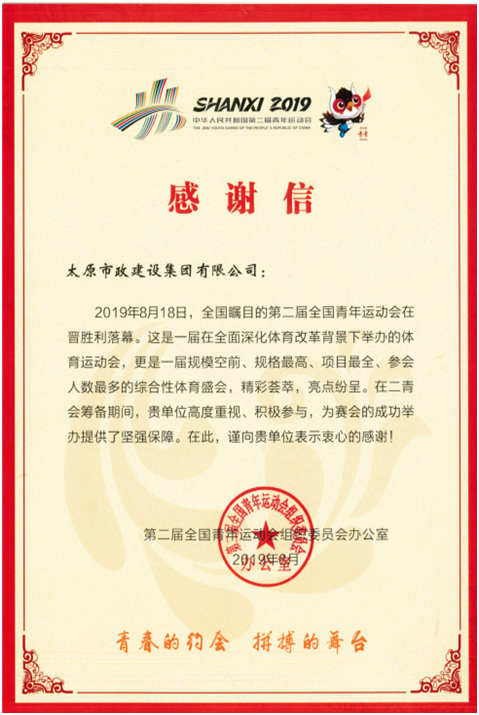 10月17日,太原市政建設集團有限公司收到了第二屆全國青年運動會組委會發(fā)來的感謝信。