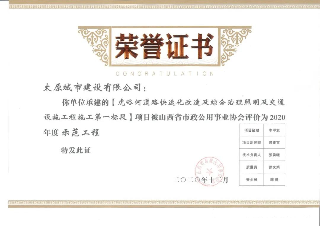 太原城建公司承建的虎峪河道路快速化改造及綜合治理照明及交通設(shè)施工程施工一標(biāo)段被評為2020年度市政行業(yè)示范工程