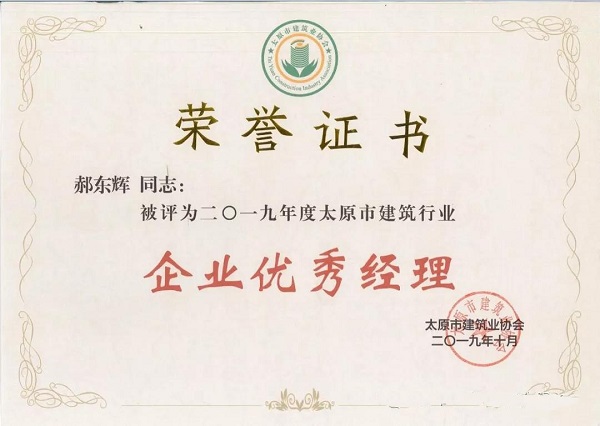 集團(tuán)公司黨委書記、董事長(zhǎng)郝東輝榮獲“2019年度太原市建筑行業(yè)企業(yè)優(yōu)秀經(jīng)理”榮譽(yù)稱號(hào)。