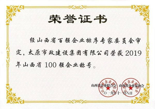 11月8日,山西省企業(yè)聯(lián)合會(huì)、山西省企業(yè)家協(xié)會(huì)攜手山西財(cái)經(jīng)大學(xué)向社會(huì)發(fā)布“山西企業(yè)100強(qiáng)排行榜”,同時(shí)發(fā)布《山西企業(yè)100強(qiáng)(年度)發(fā)展報(bào)告》。太原市政建設(shè)集團(tuán)有限公司榮獲“2019年山西省100強(qiáng)企業(yè)”稱號(hào),排名第39位。