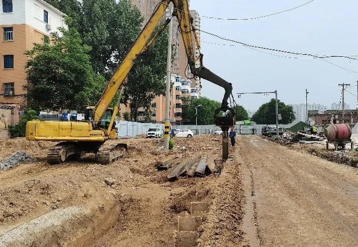 除迎新街北段外,其他道路在溝槽開挖時,都需要在施工過程中對老舊居民樓進行保護。項目部經過仔細研究后,決定在建筑物旁采用兩排高壓旋噴樁進行隔離保護,減少施工對老舊建筑物的影響,確保工程安全。面對地下管線復雜的情況,項目部積極聯(lián)系業(yè)主,多次與煤氣、自來水、供熱等公司溝通協(xié)調,最終對影響施工的管線進行改遷,為工程順利施工奠定了基礎。同時,迎新西一條施工范圍內有十余根高壓電線桿,緊鄰雨污水管,因電線桿短期內無法遷移,若進行溝槽開挖,存在極大安全隱患,為確保施工安全,項目部采用打鋼板樁的方式對電線桿進行保護,順利解決了施工難題。